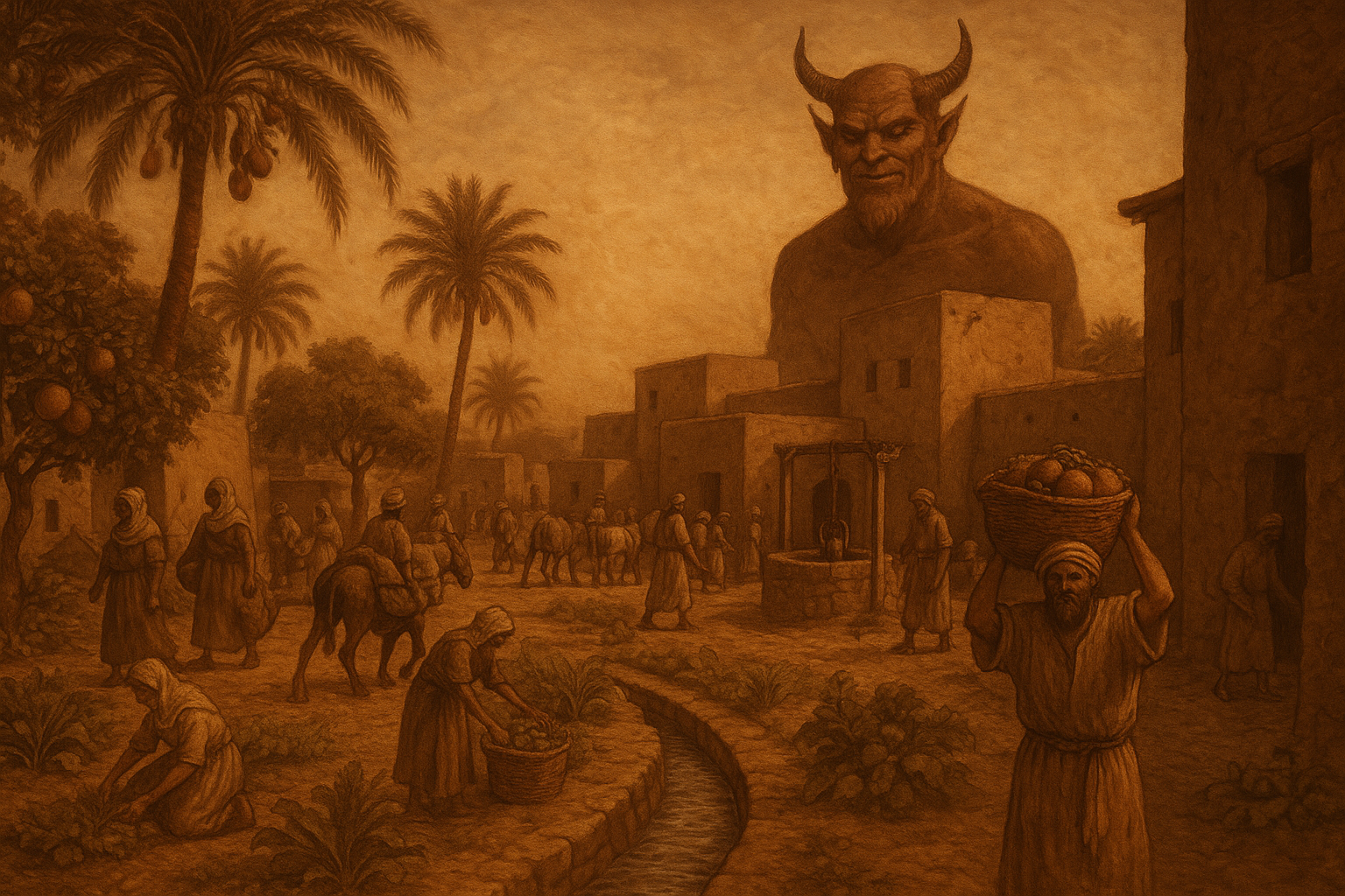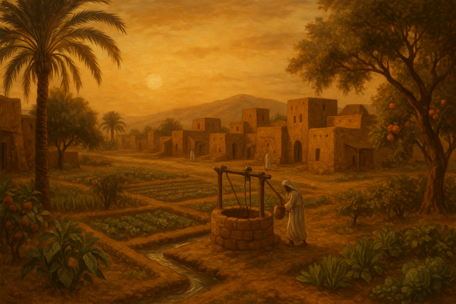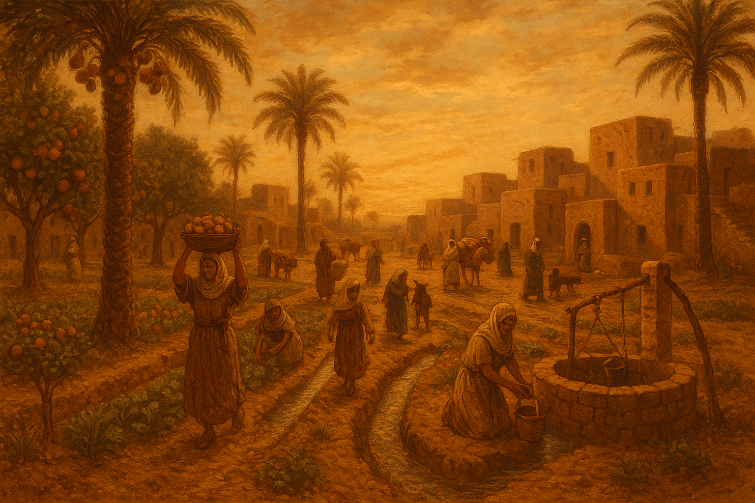 Sebuah perkampungan kuno dengan kegiatan pertaniannya. (Image by Chatgpt)