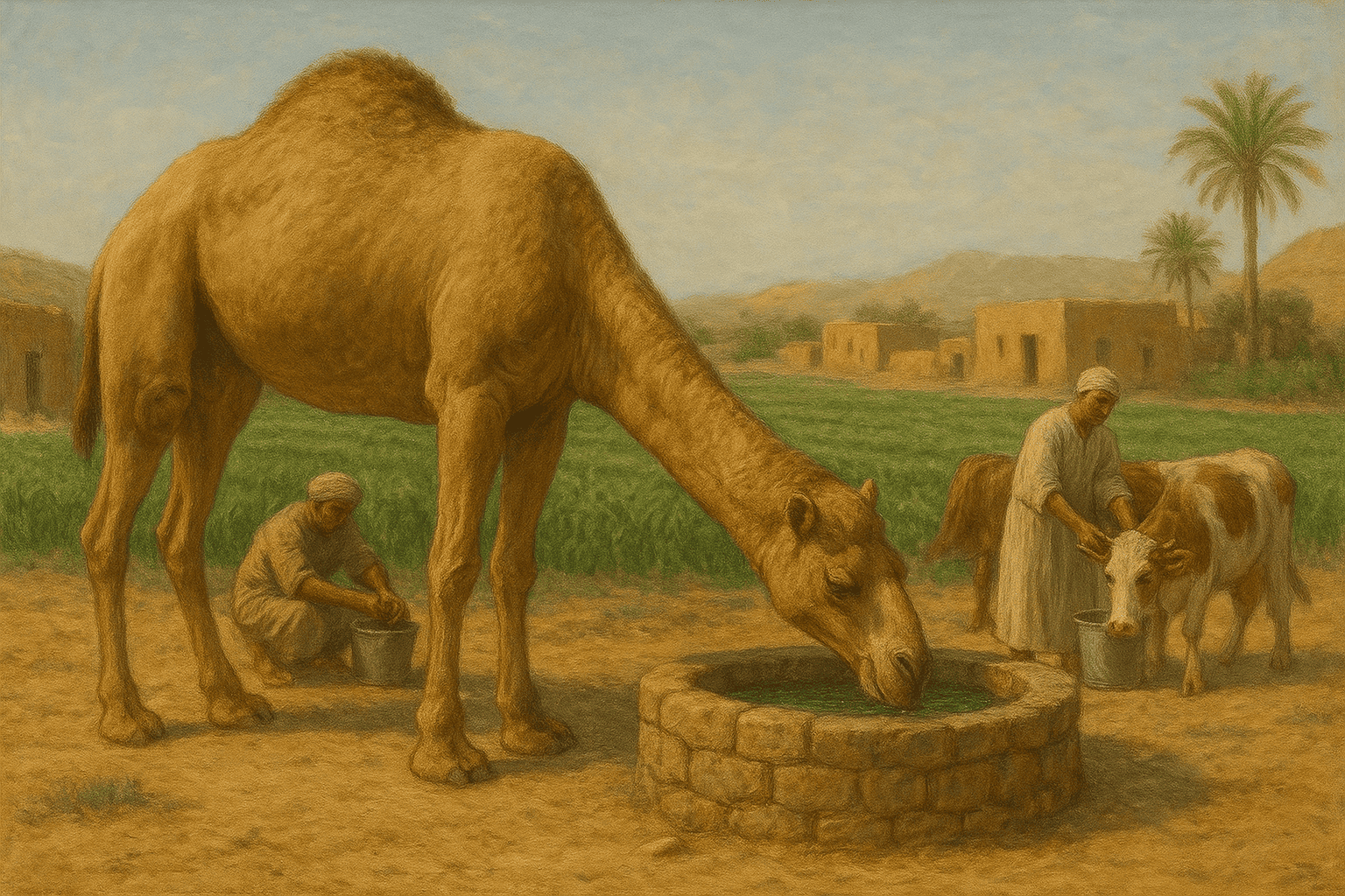 Seekor unta betina yang minum air dari sebuah sumur. (image by chatgpt)