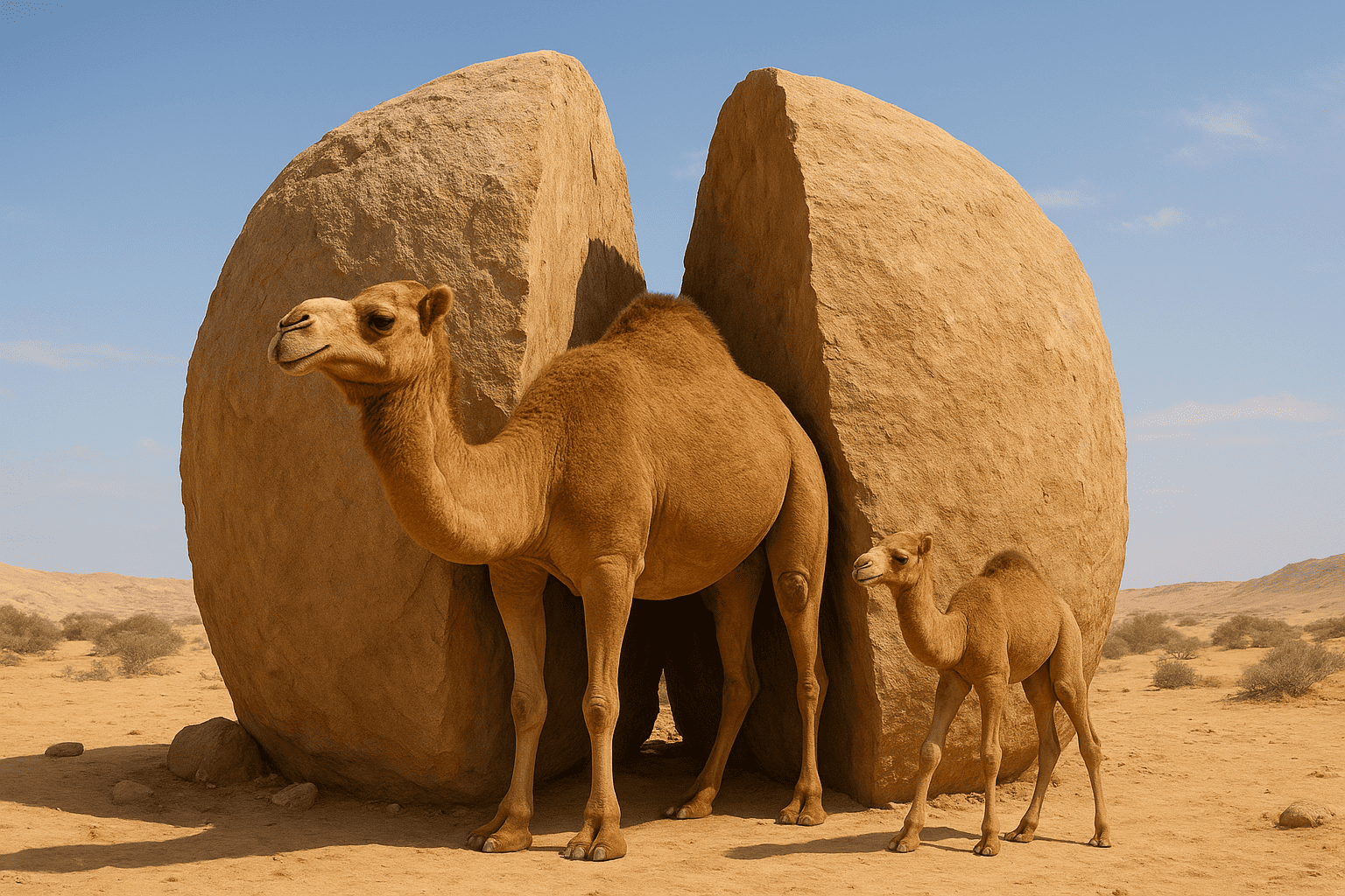 Seekor unta betina yang muncul dari dalam batu beserta anaknya. (image by chatgpt)