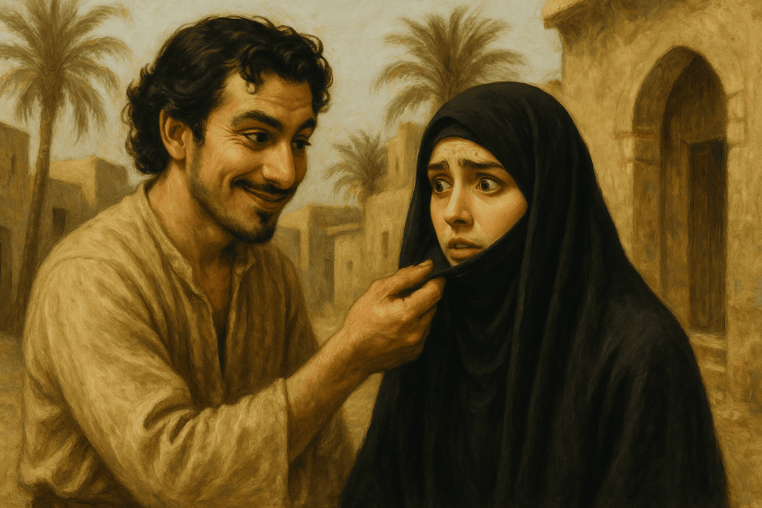 Karena si perempuan terhormat ini begitu mencintai dan memuliakan Rasulullah SAW, dia pun mau membuka cadarnya karena si pemuda berani bersumpah atas nama Rasulullah. Setelah cadar dibuka, nampaklah wajah lentik nan anggun hingga membuat si pemuda terpesona. Tak ada angin tak ada hujan, dengan ngawurnya si pemuda malah melecehkan si perempuan dengan memegang dagunya.